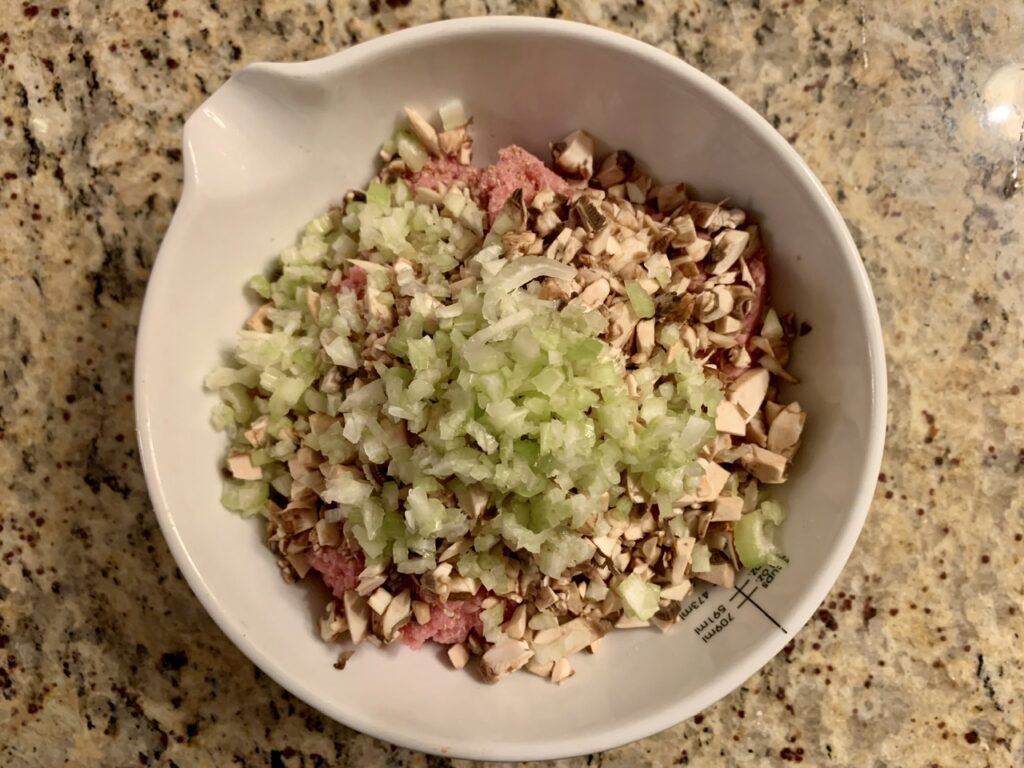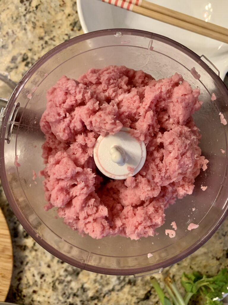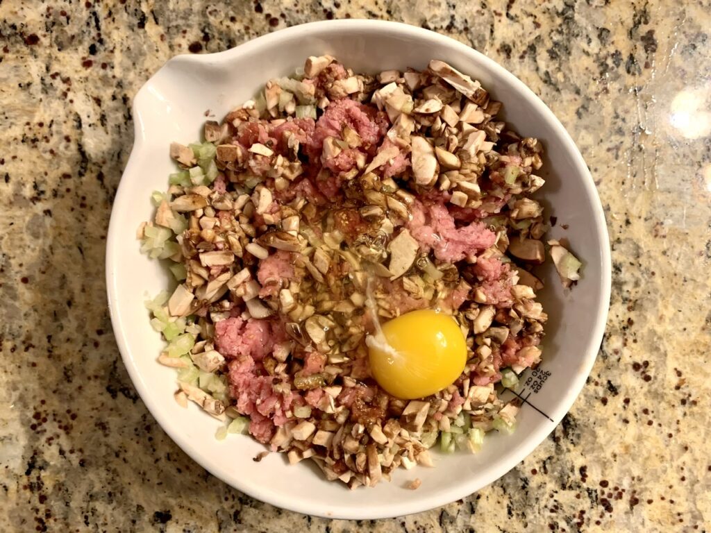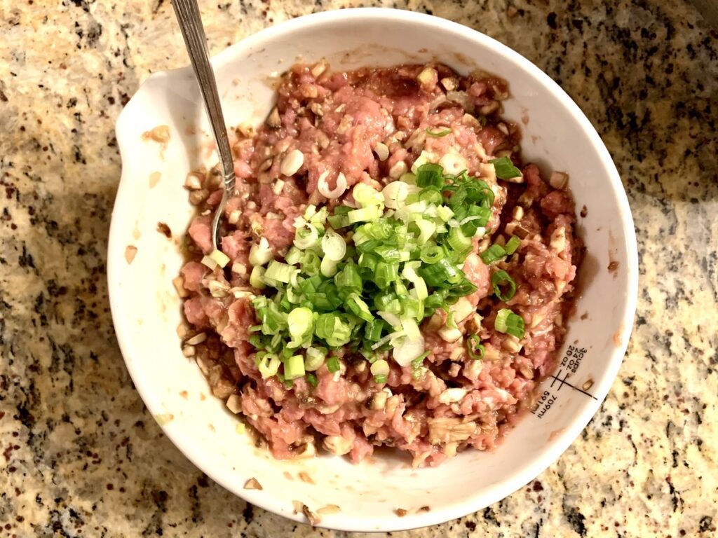 • Prepare the meat by cutting into chunks. Place in food processor together with 1 inch of fresh ginger and blend until the meat is minced. Add in chopped celery, mushroom and green onions together with the soy sauce, oyster sauce, salt, pepper, oil and 1 egg. Mix until well combined. Set aside.
