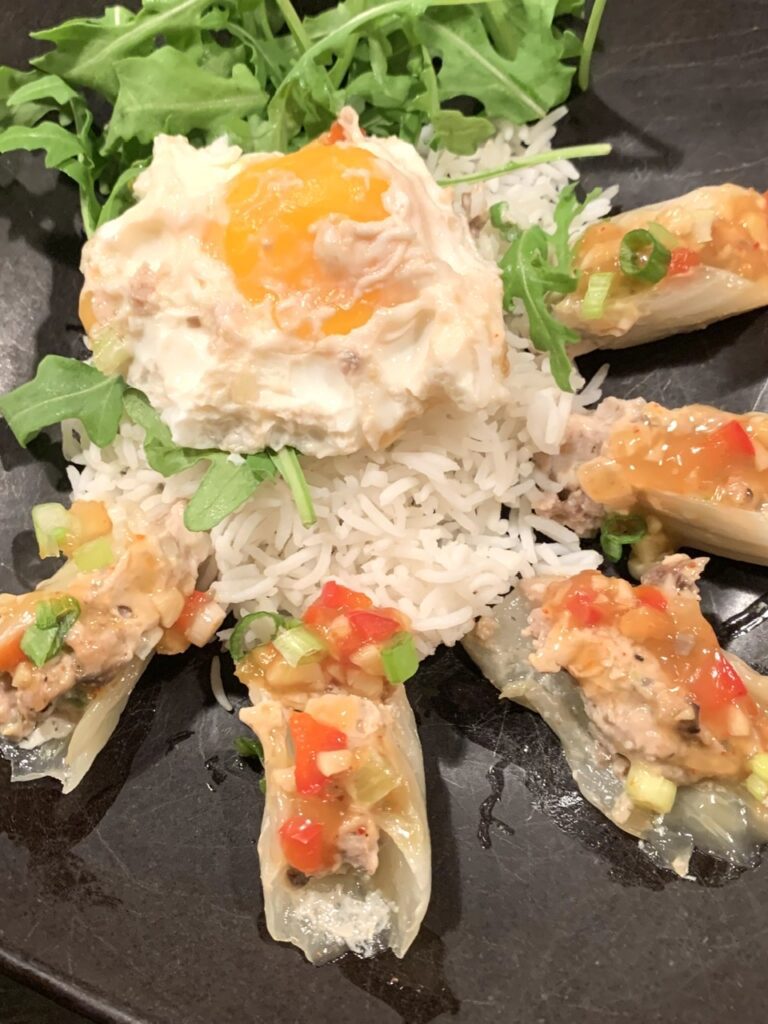 Fill the wrappers and place in heat-proof plate. Starting on the outer edge of the plate, arrange the wrapped cabbage “petals” in a concentric circle so it looks like a flower. Continue until all the cabbage wrappers are used up. Place the remaining filling into the middle of the plate. Crack an egg in the middle of the filled plate.