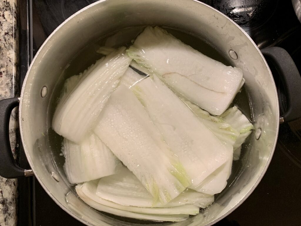 • Boil a big pot of water. Add 1 Tbs of salt and oil. Blanch the prepared cabbage for about 2-3 minutes or until it has softened. Remove from water and let it cool.