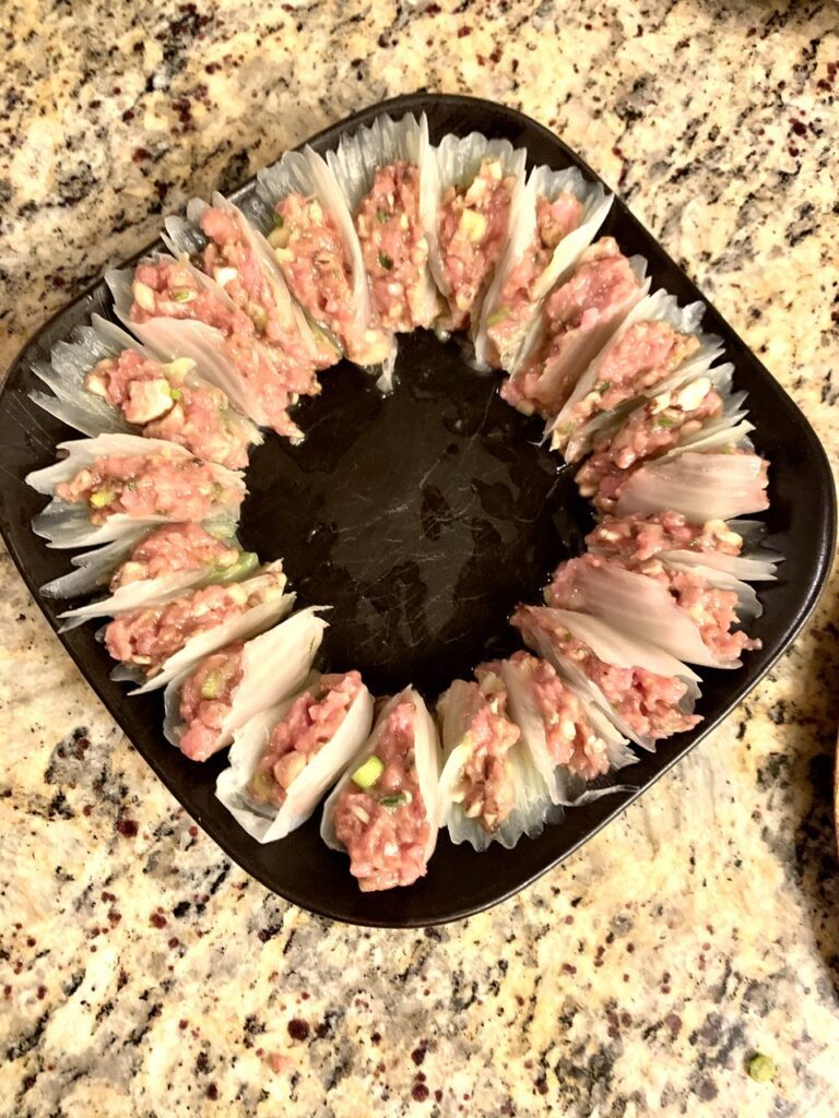 Even though it looks fancy, the ingredients are simple – minced lean meat, cabbage leaves and seasoning. The fun thing about this recipe is slicing the Napa cabbage leaves thinly into wrappers. The natural structure of the leaves creates flower petals-like pieces.