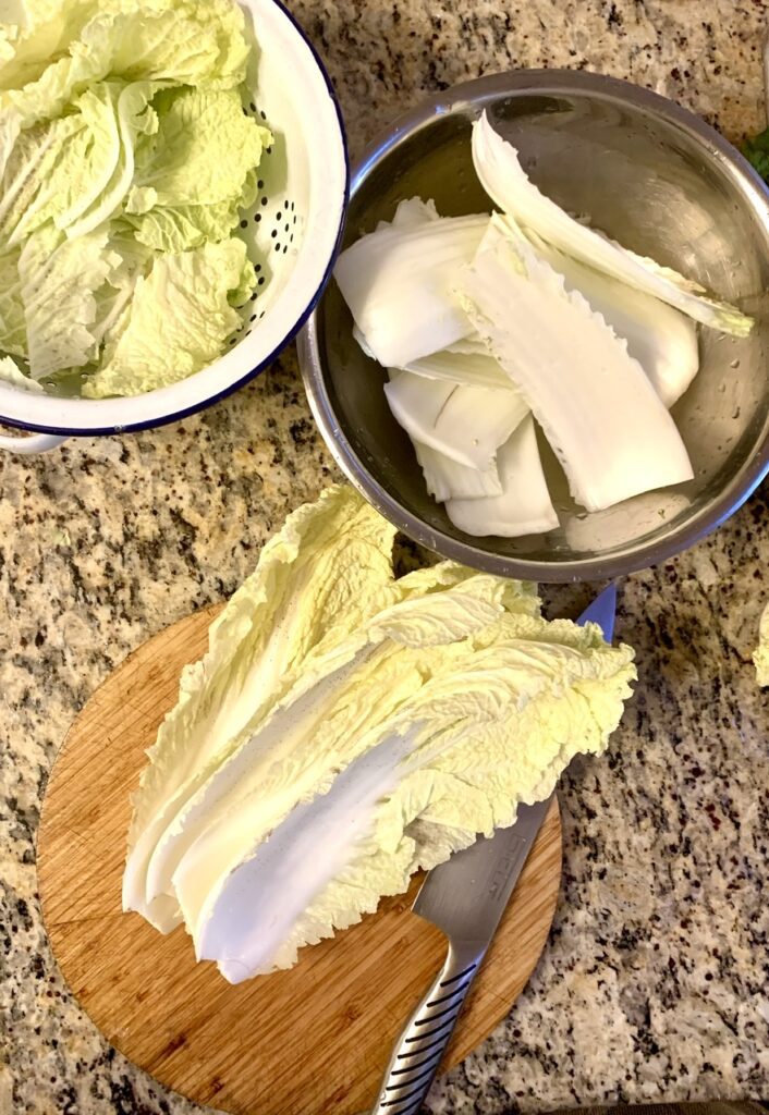 Prepare the steamer. Add water and bring water to boil. As the steamer is getting ready, take the cooled cabbage leaves stems and slice them thinly at an angle to create little wrappers.