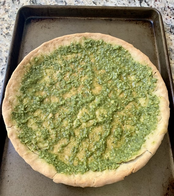 - On the pre baked pie crust, spread out the pesto mixture evenly on the bottom.