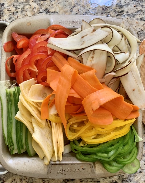 Start by using a mandolin slicer or vegetable peeler, slice the eggplant, zucchini, yellow squash, carrots and peppers into thin ribbon-like slices.