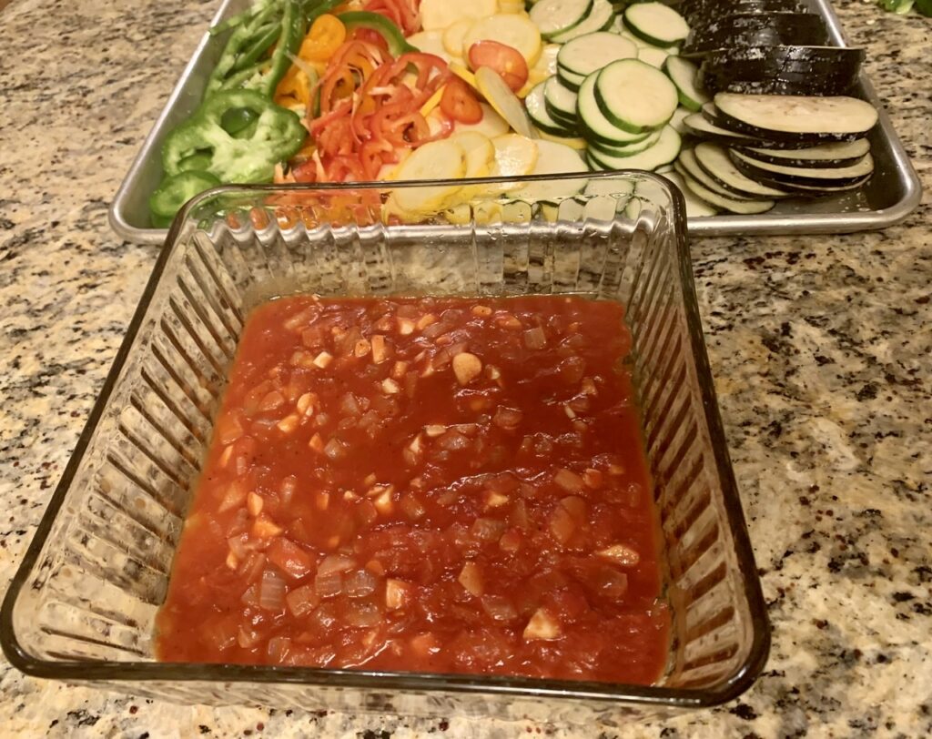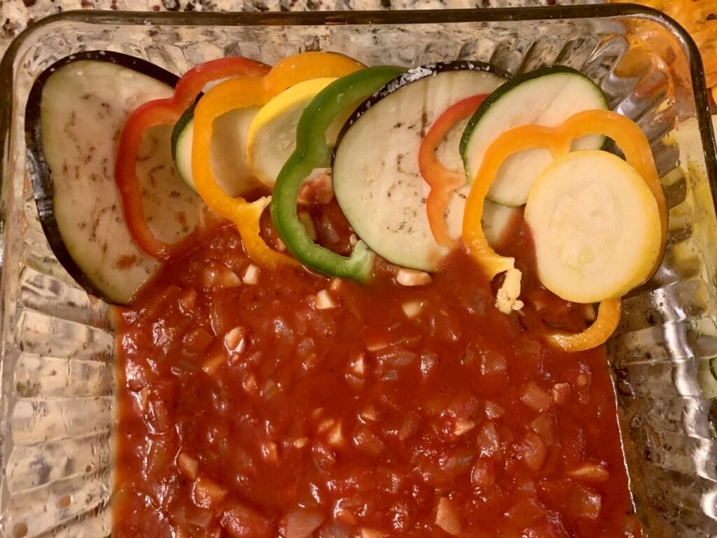 I did a bit of research and found a recipe by Julia Child that calls for slicing the vegetables thinly and then laying them neatly in a baking dish. It makes a beautiful dish to serve at the table. After making this a first time it has been tweaked and adjusted with each bake since.
