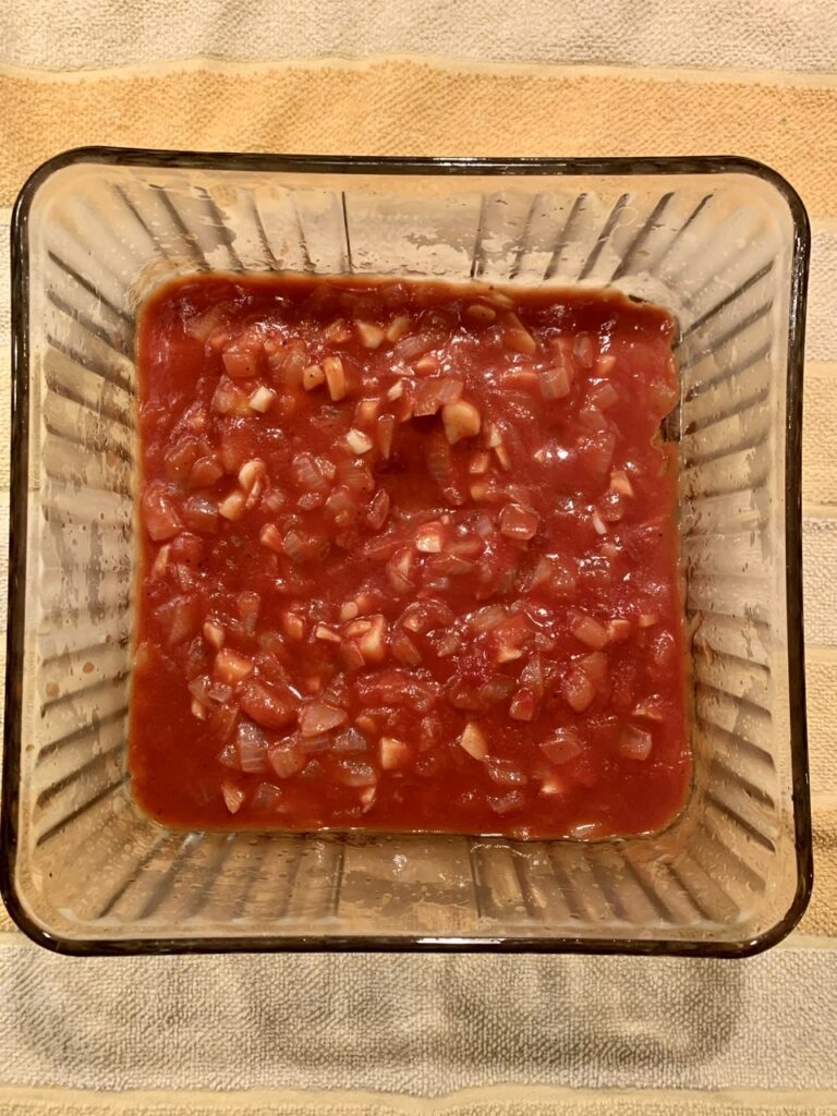 - Add tomato paste, water, and 1 Tablespoon of olive oil to the sautéed onion and garlic in the pan. Stir to combine until you have a nice thick sauce. Add salt and ground pepper to taste. When ready, pour this sauce even across the bottom of the prepared casserole dish. Set aside.