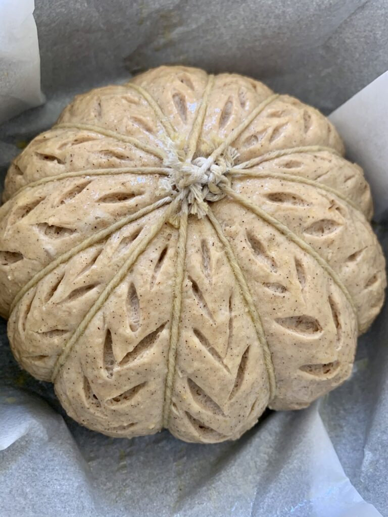 When ready, remove the dough and place on parchment paper, smooth side up. If using the bannetton, you will see visible circular lines on the surface.