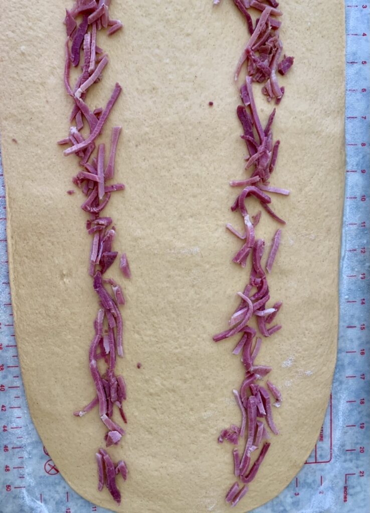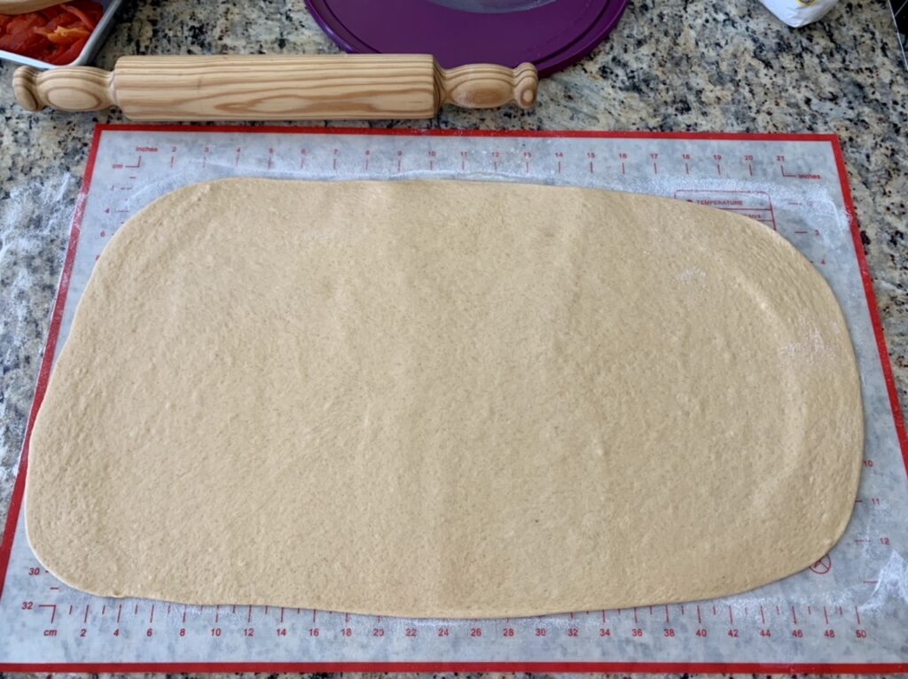 When the dough is ready, tip in onto a well floured work space. Punch down/deflate the dough and use the rolling pin to roll out the dough into a rectangle, about 20″ x 12″ (50cm x 30cm). I usually eyeball this, using the silicone mat as the guide.