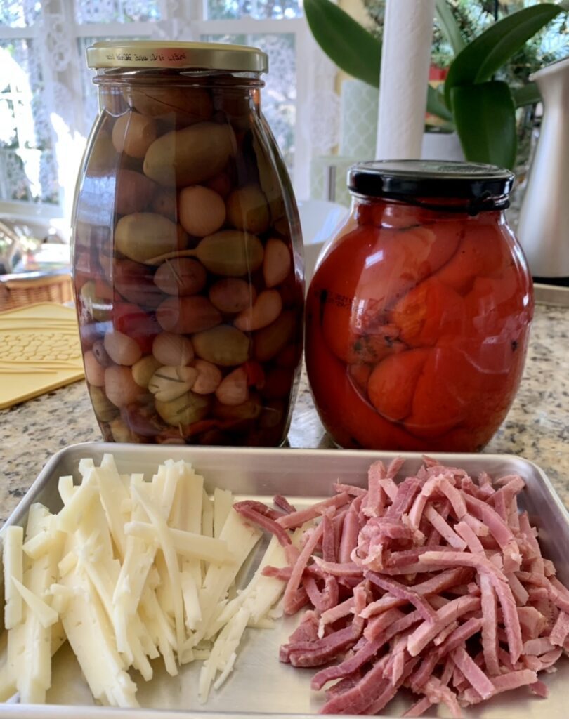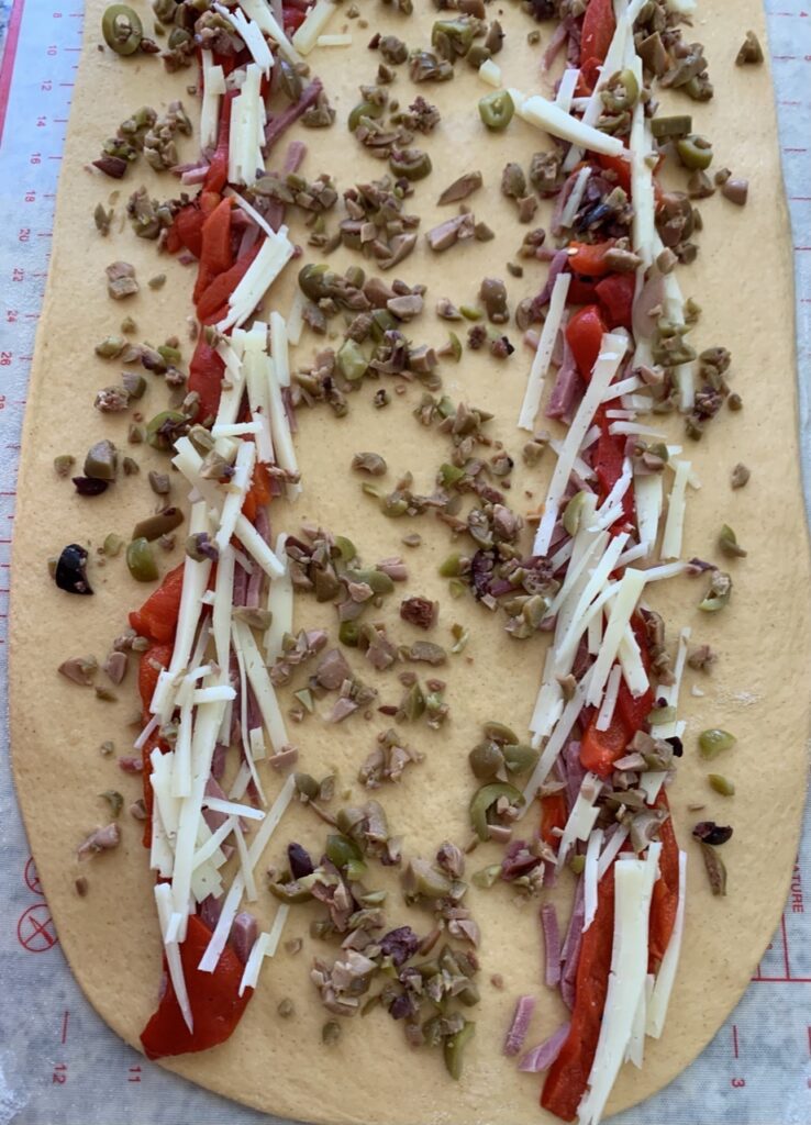Prepare the filling – ham, cheese, red peppers and olives. Slice the ham (I used spiral holiday ham here since that’s what I had at hand), cheese and red peppers into strips. Chopped pitted brined olives coarsely. Set aside.