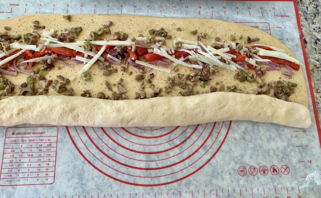 Next, place the the ham slices in 2 stripes on the dough, lengthwise (parallel to the long sides). Then, the red peppers goes on top, followed by the strips of cheese. Carefully scatter the chopped olives evenly all over the dough. Finally, liberally sprinkle the fresh ground pepper all over everything and you are ready to roll this up!