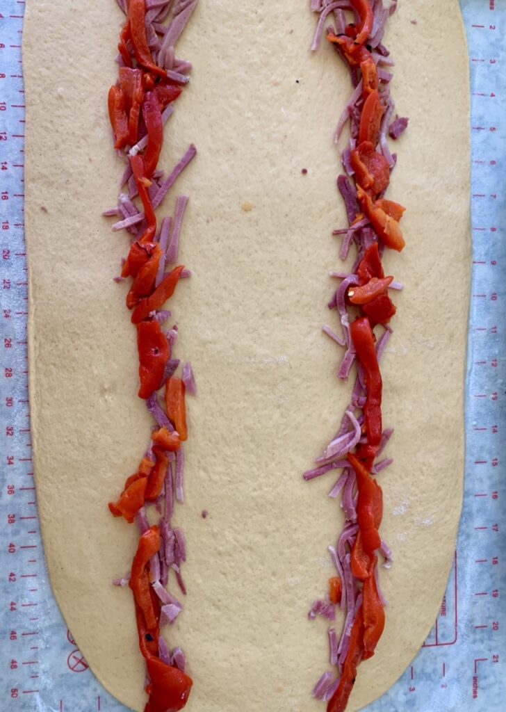 - Place the ham slices in 2 stripes on the dough, lengthwise (parallel to the long sides). Next, place the red peppers on top and then the manchego cheese.