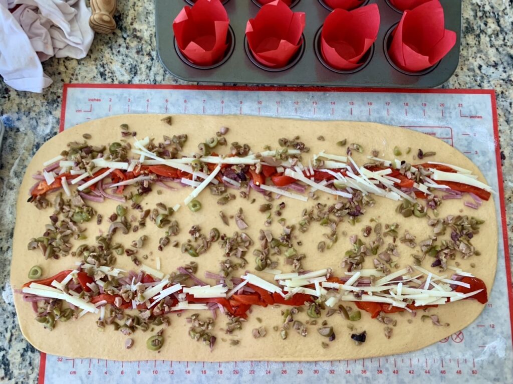 This clever and delicious spiral bread muffin uses the most popular ingredients you’ll find in Spanish inspired dishes: Jamón or ham, delicious Manchego cheese (made from sheep’s milk), roasted red peppers, briny cured olives and good olive oil. Combining these ingredients and wrapping them all up in a blanket of paprika tinged bread dough is just pure flavor genius.