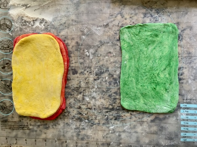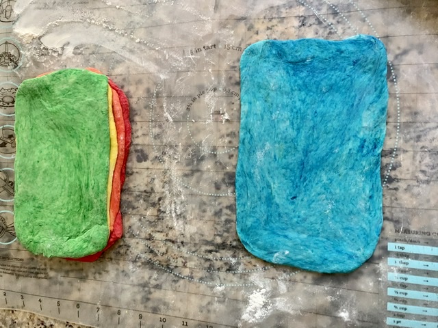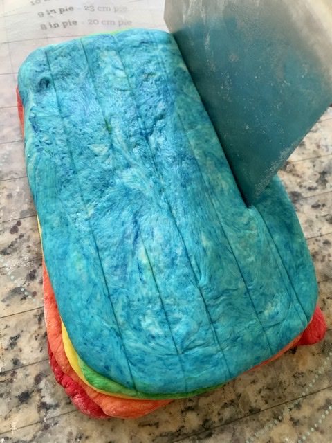 Repeat with the Orange color dough. When done, carefully place the Orange rectangle on top of the Red. Repeat with the Yellow, Green and Blue doughs, rolling each one out, shaping into rectangle, and placing on top of one another. You will have a stack of 5 layers of dough, Red at the bottom, then Orange, Yellow, Green and Blue.