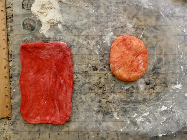 When ready, tip out the Red color dough onto a lightly floured work surface. Using a lightly floured rolling pin, roll out the dough to an approx 8″ x 6″ (20 x 12cm) rectangle. Set aside.