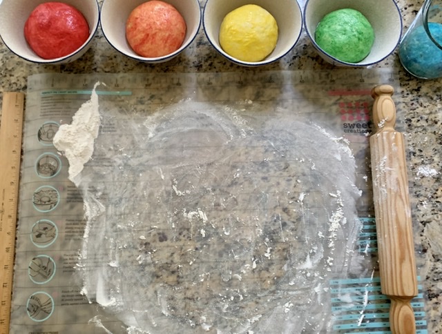 - Next, divide the dough into 5 equal pieces and cover with a damp tea towel. Working with 1 piece of dough at a time add a few drops of food coloring onto the dough, fold it up and around the color. Knead the dough to distribute the color evenly. Add more food coloring as needed and adjust until it reaches the desired color. Place each piece of colored dough into a greased bowl and cover. Repeat with the remaining pieces, each using a different color until you have 5 brightly colored dough balls. Let the dough rest and rise for approx 1 hour, or until they have doubled in size.