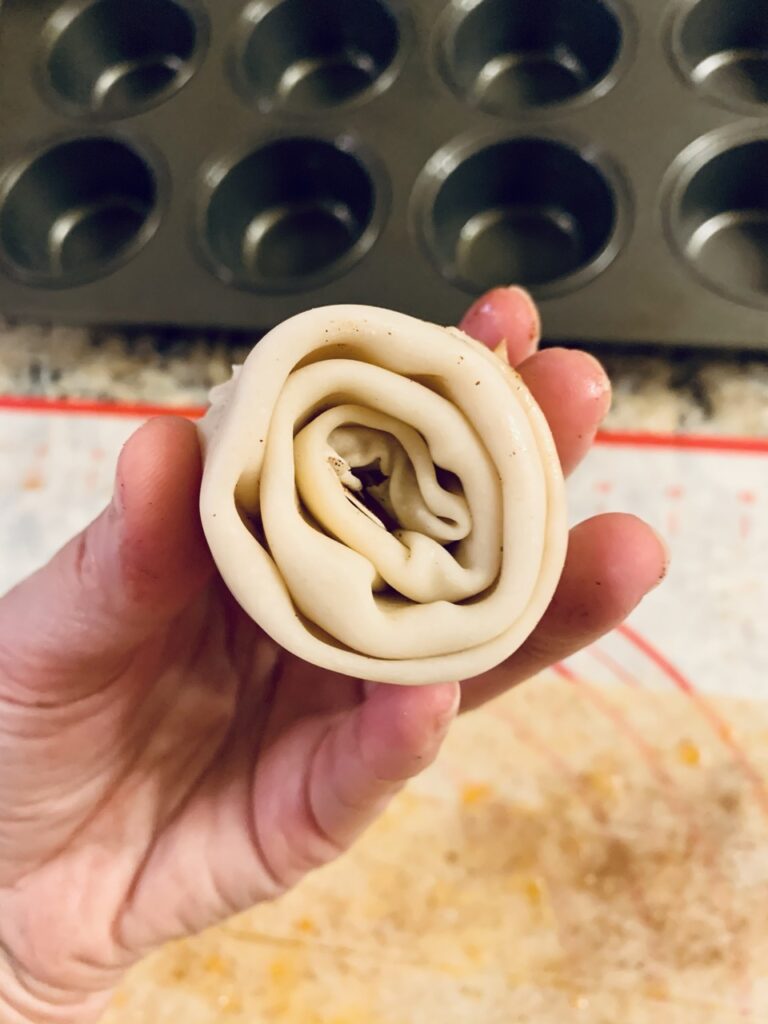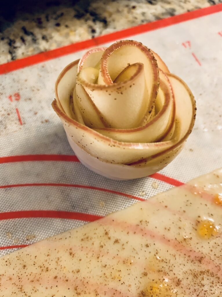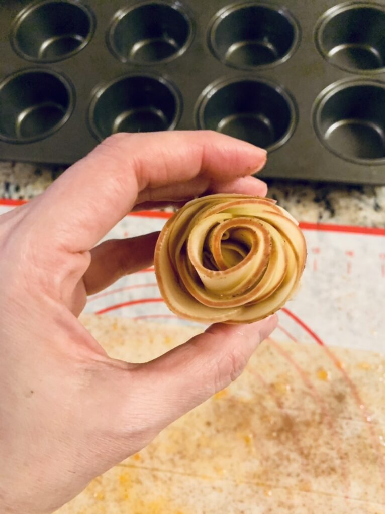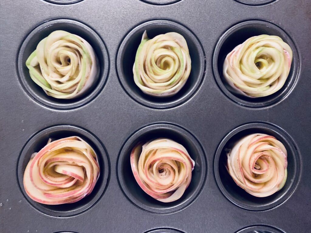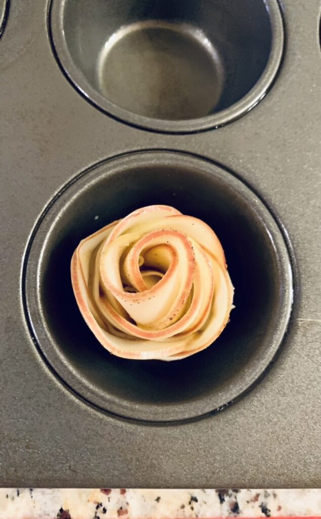 Place the apple flower tart in greased muffin pan. Repeat with the other dough strips.