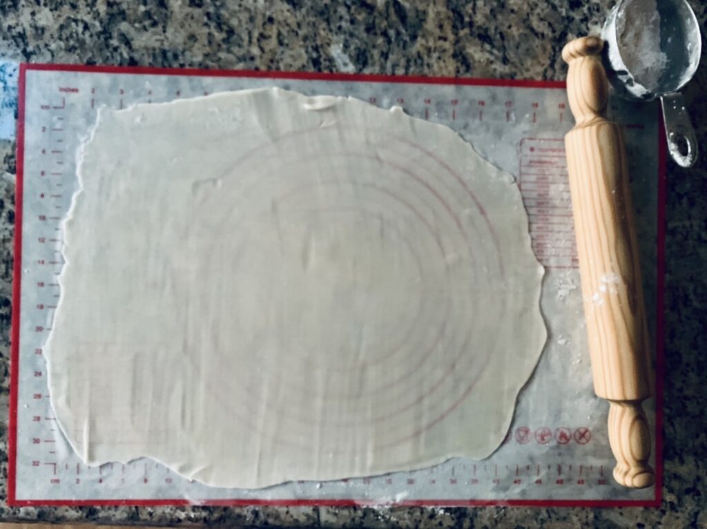- Preheat the oven to 375°F (190°C). When the dough is ready, roll out on lightly floured work surface into a rectangle as thinly as possible. Cut into 6 long strips.