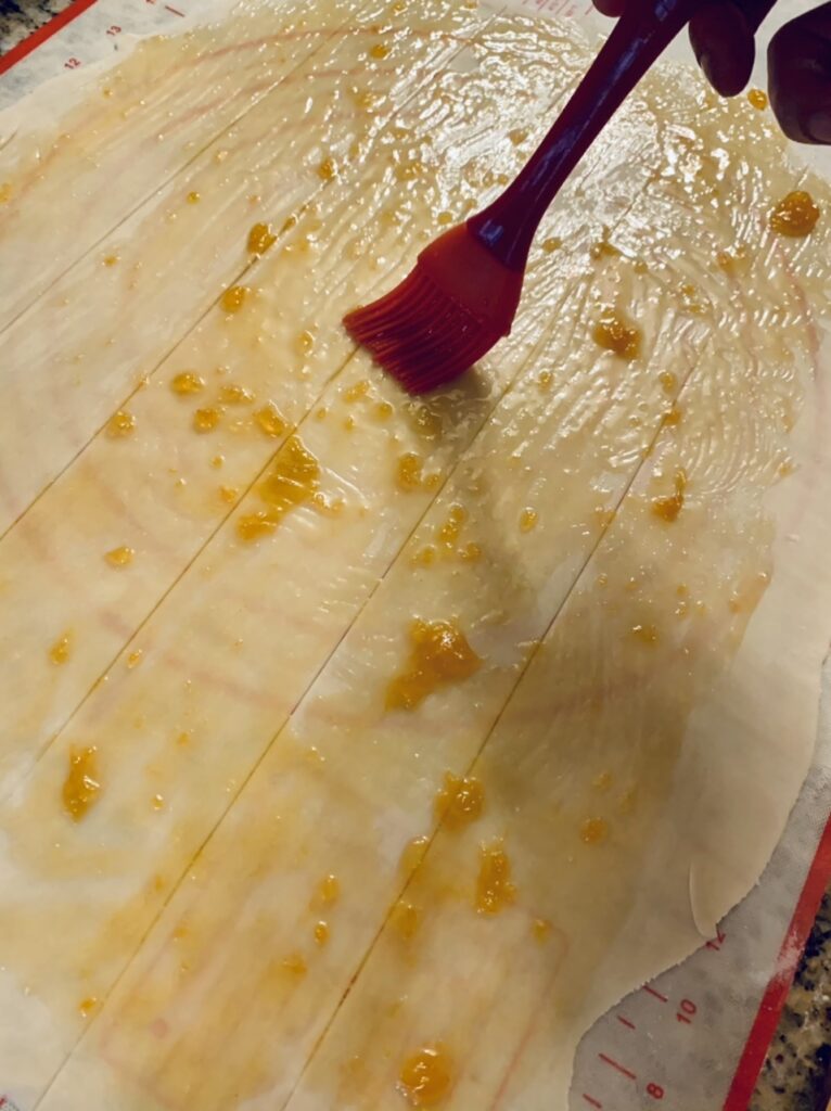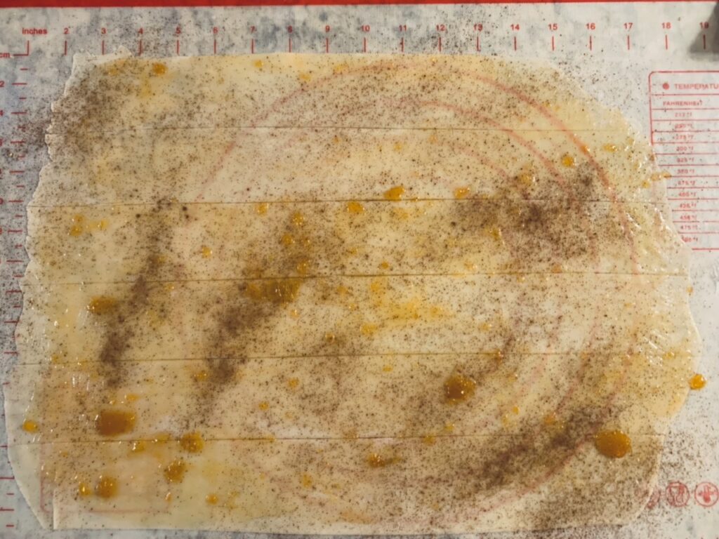 Next, brush jam thoroughly over the strips of dough. Lightly sprinkle the entire dough with cinnamon (optional).
