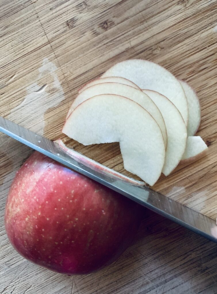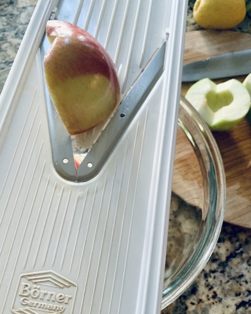 When the dough is chilling, peel, core, and slice the apple as thinly as possible. Using a kitchen mandoline would help ensure the slices are very thin and even in size.