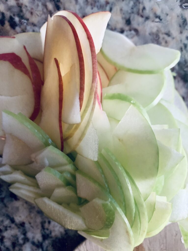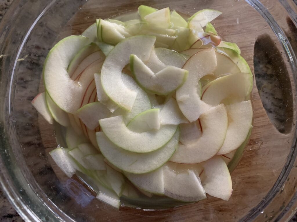 - When the dough is chilling, peel, core, and slice the apple as thinly as possible. Using a kitchen mandoline would help ensure the slices are very thin and even in size. Place in microwave safe bowl. Add water to just cover the apple slices. Cut and squeeze lemon juice over the apple slices. Stir to coat the apple and microwave for approx. 2 to 4 minutes to soften. Drain and pat dry the apple slices