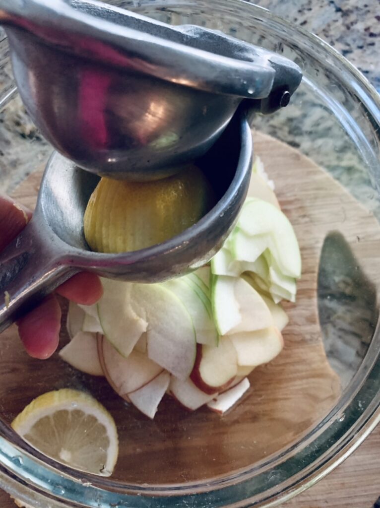 Place in microwave safe bowl. Add water to just cover the apple slices. Cut and squeeze lemon juice over the apple slices. Stir to coat the apple and microwave for approx. 2 to 4 minutes to soften. Drain and pat dry the apple slices.