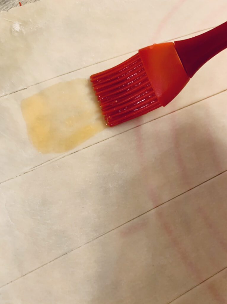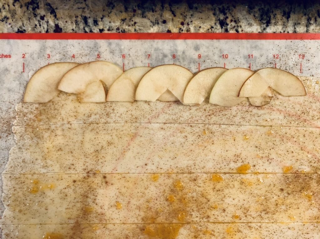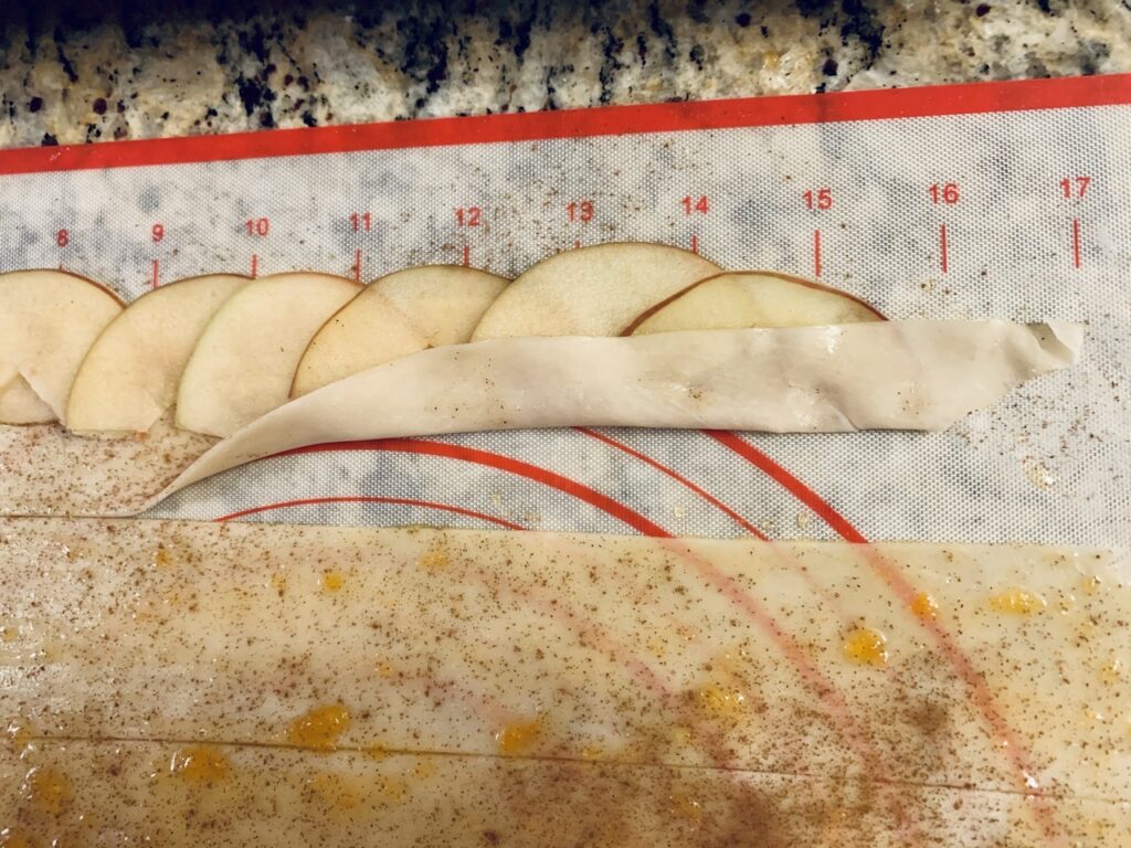 - Brush jam thoroughly over the strips of dough. Lightly sprinkle the entire dough with cinnamon (optional). Place the apple slices along the top of the strip, overlapping one another. When done, fold up the lower half of the dough strip and lightly brush with more jam glaze. Carefully roll up the dough to form a flower.