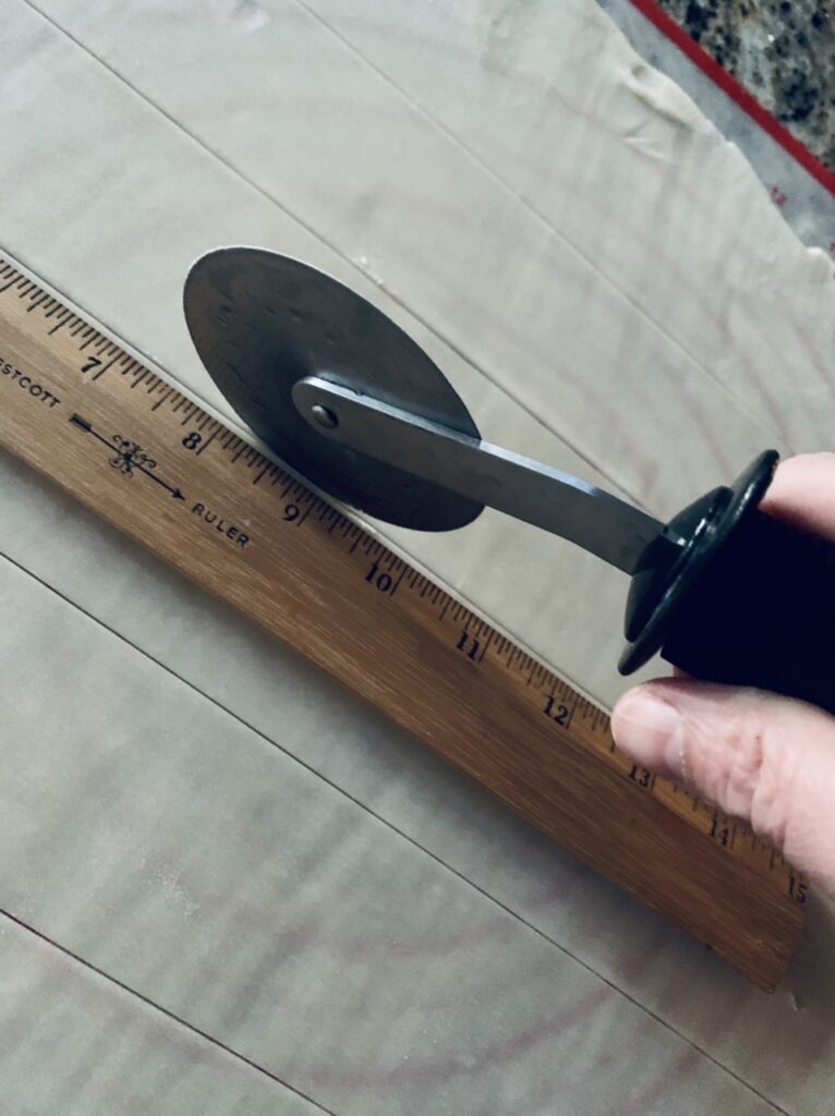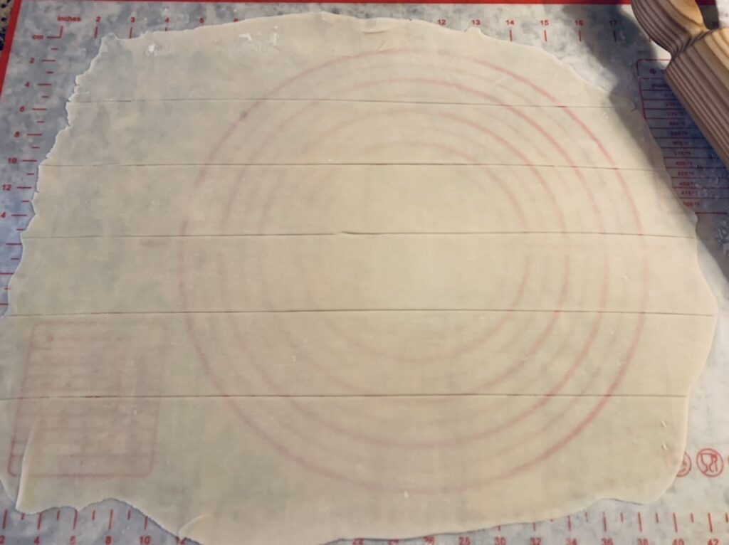 Preheat the oven to 375°F (190°C). When the dough is ready, roll out on lightly floured work surface into a rectangle as thinly as possible. Cut into 6 long strips.