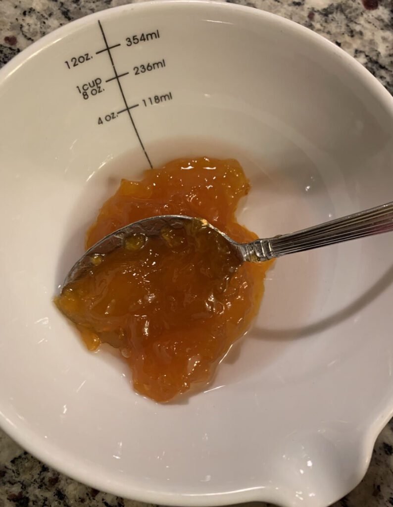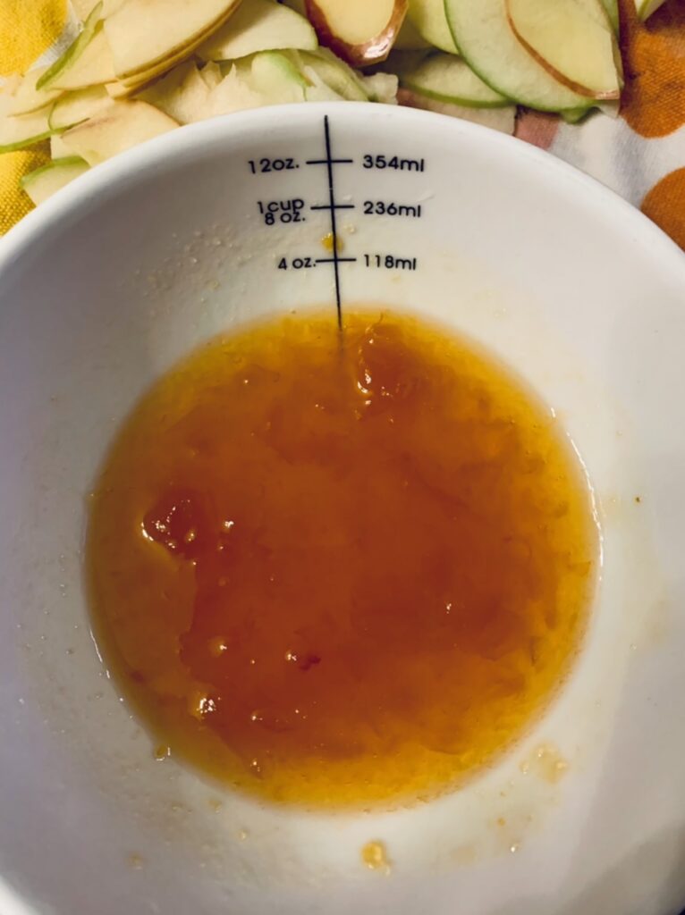 - Mix 3 heaping tablespoon of Apricot Jam with 2 teaspoon of water. Stir to thoroughly combine. Zap in microwave for about 30 seconds to a minute until it is heated through and that the glaze is thick and spreadable.