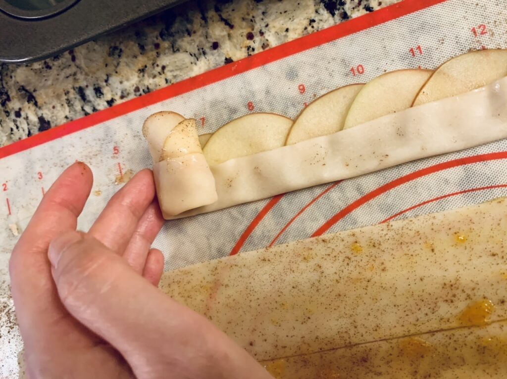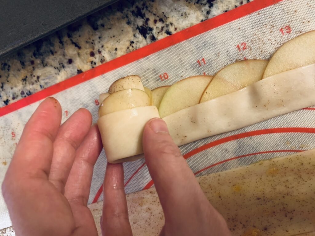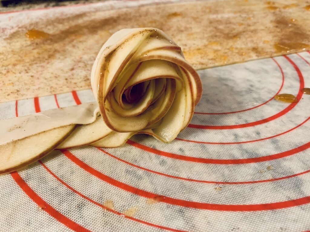 Place the apple slices along the top of the strip, overlapping one another. When done, fold up the lower half of the dough strip and lightly brush with more jam glaze. Carefully roll up the dough to form a flower.