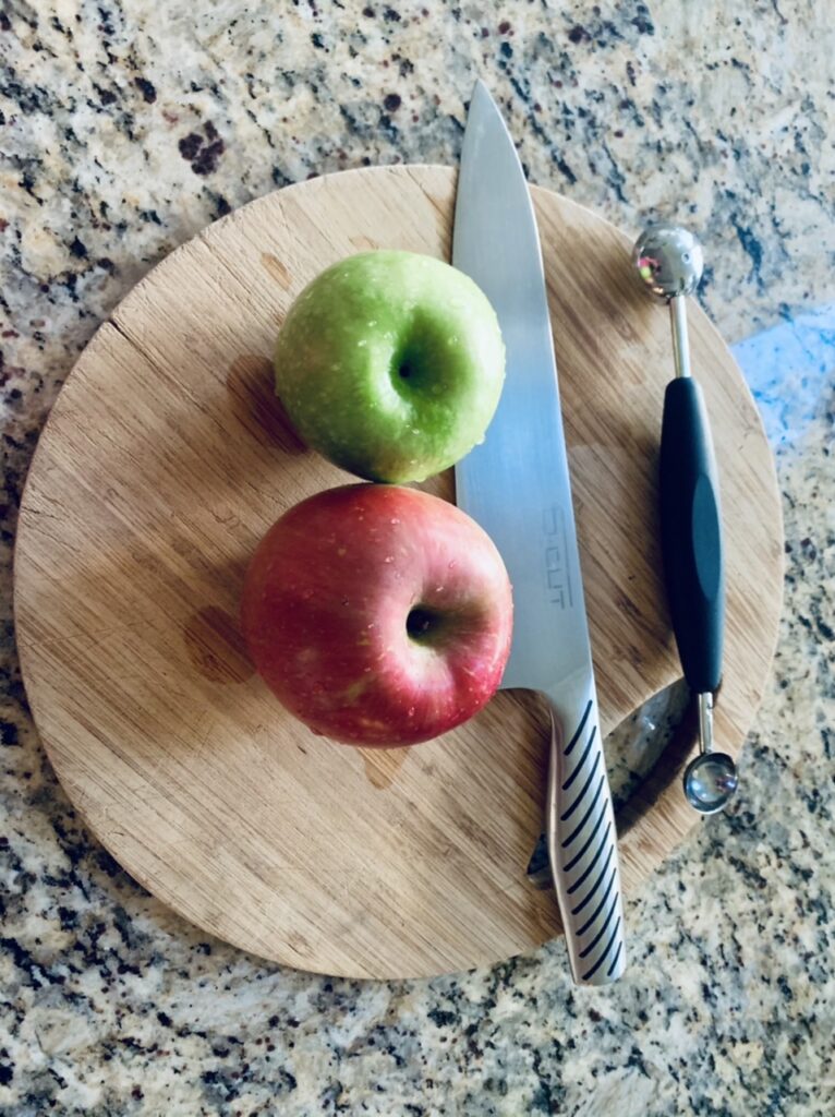 Second, preparing the apples. I think the tarts will look very pretty using red apples, but I used what I had at hand – a pink Sweet Tango and a green Granny Smith. Please feel free to use your favorite apples. And last but not least, assembling the whole thing and glazing it with the apricot jam to hold it together.