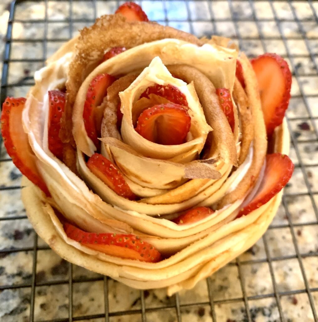 This recipe is lightly adapted from https://tasty.co/recipe/strawberry-rose-crepe-cake
