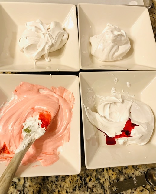 - Reduce oven to 225ºF (100ºC) and divide the whipped meringue into 6 bowls. Add drops of Food Colour Gel to 4 bowls to reach desired red shades and leave 2 bowls white.