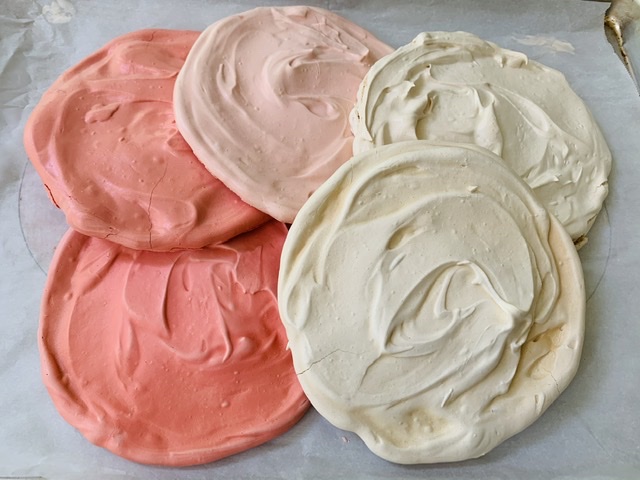 Prepare the 5 parchment paper with 7-8″ (18-20 cm) diameter circles traced onto a paper. Then, turn the paper over and transfer meringue evenly to the circles.
