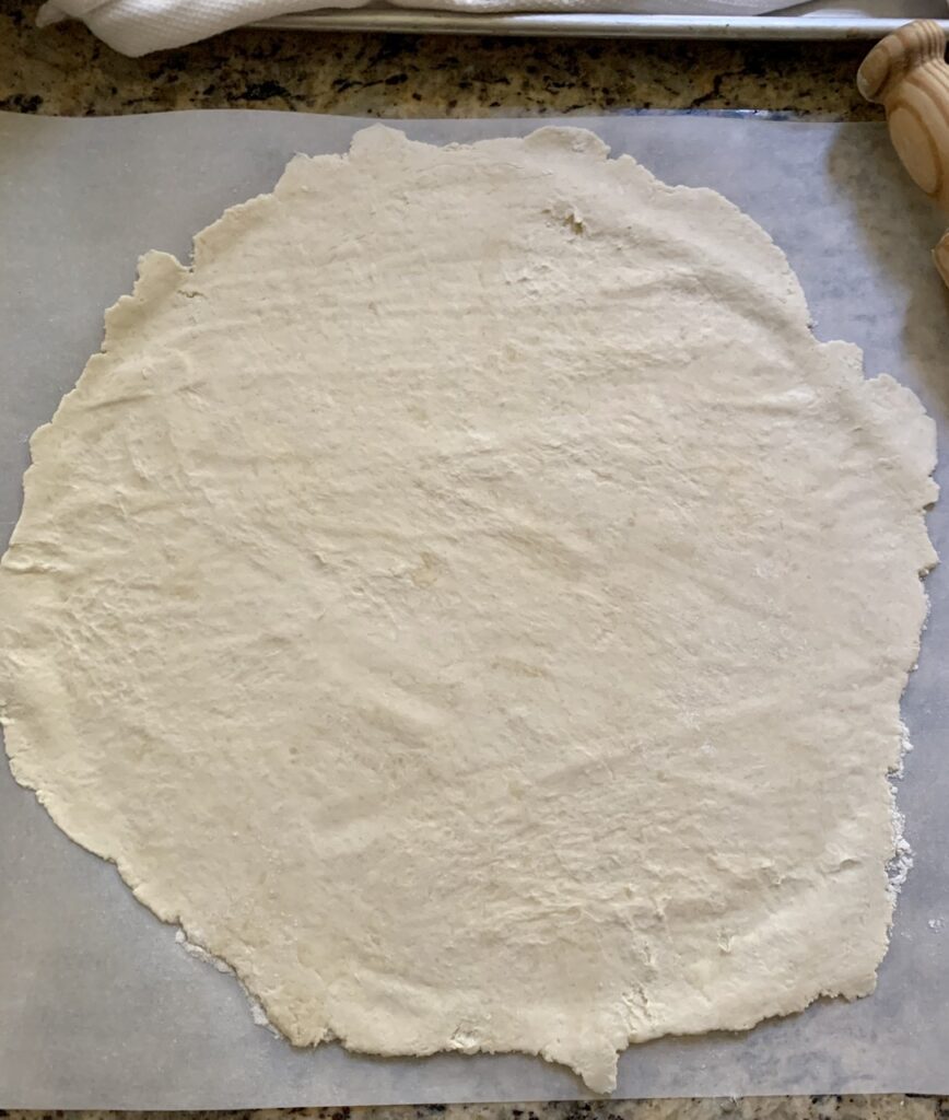 Next, roll out chilled dough into approx. 12″ or 14″ circle. Then, transfer to the prepared baking sheet.