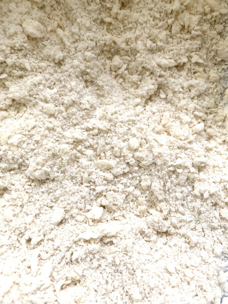 Let’s start by making the crust. Whisk together flour and salt to combine. Add grated butter and work in the butter until the mixture resembles coarse breadcrumbs.