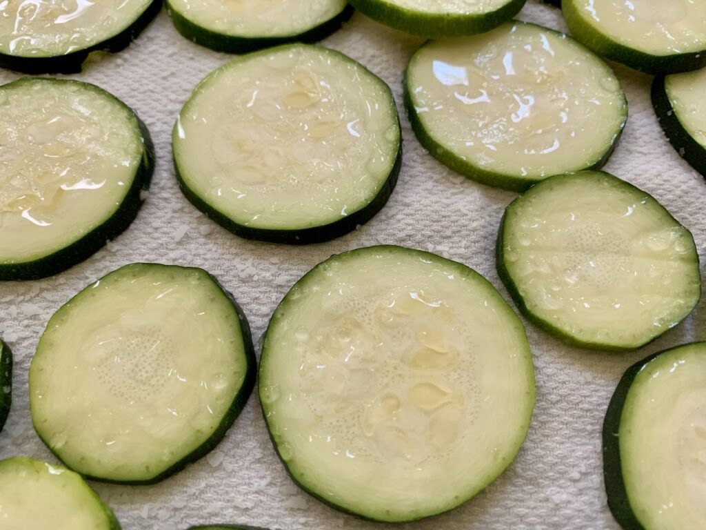 When the dough is chilling, prepare the zucchini. Slice into ¼” rounds and place on top of a pan, lined with a clean kitchen towel or paper towel.