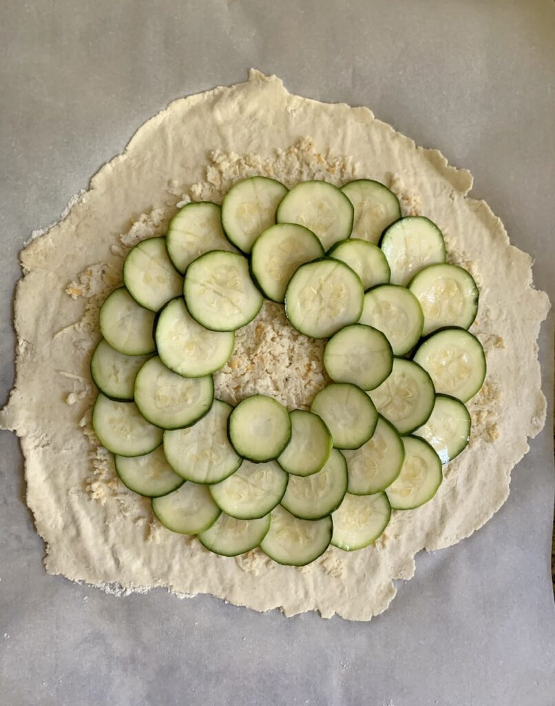 The hands-on prep is fairly quick – mostly on making the galette crust. Make sure the ingredients for the crust are cold so that the dough will come together quickly. The other is slicing the zucchini into even slices. I find that using a kitchen mandoline ensures a uniform size, but since this is only one zucchini, simply using your very sharp kitchen knife should suffice.