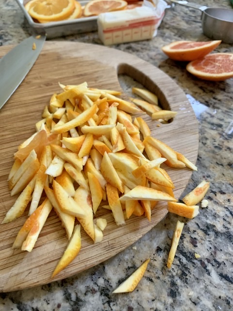 - Start by preparing the fruits. Zest the rind from the oranges (about 1 tablespoon), set aside. Then, prepare the fruits for the bottom of the pan. Slice the grapefruit, oranges, and clementine to ¼ to ½" thick rounds. Use a sharp knife to remove the rind from each citrus slice.