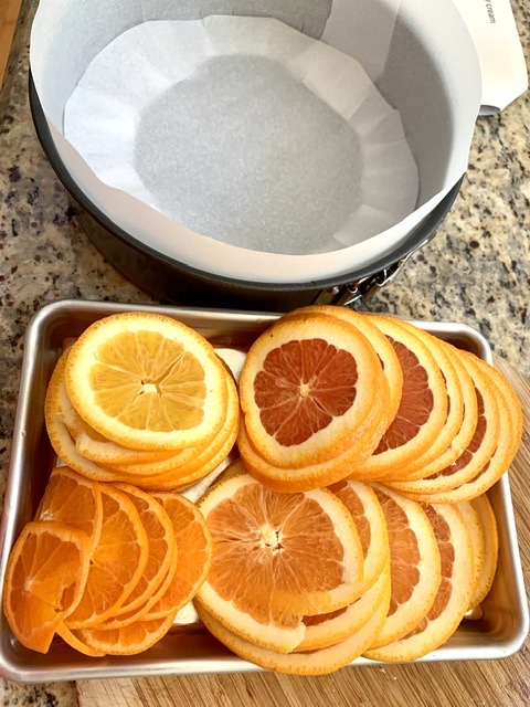 When ready, pour this syrup mixture into the bottom of the prepared cake pan. Arrange the citrus slices in an overlapping pattern. Then set the pan aside.