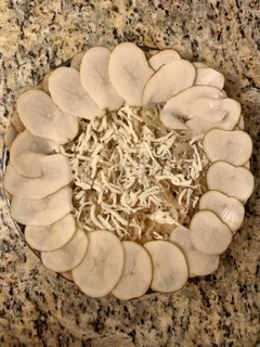 - Starting from the outer edge of pan, arrange potatoes to overlap around the entire pan twice. Sprinkle lightly with paprika and salt. Add black pepper to taste. Add softened onions and spread evenly. Add shredded cheese. Top with remaining sliced potatoes in the same overlap pattern.