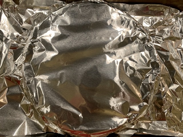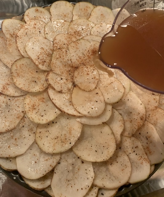 Next, put prepared pie dish onto a cookie sheet or roasting pan to catch any spillage. Very carefully, pour broth evenly over the prepared pie. Cover with foil and pop into the hot oven for about 50 minutes or until the potatoes are soft and cooked. The foil steams the potato slices in the broth.