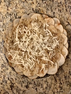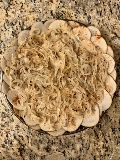 The 2 main ingredients are from the pantry – potatoes and onions. The rest is seasoning and liquid to help cook the potatoes. Join me as I put this easy- to-make flourless pie together!