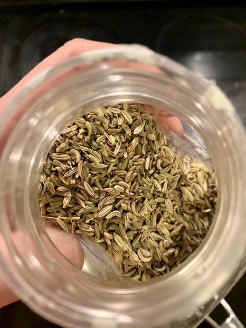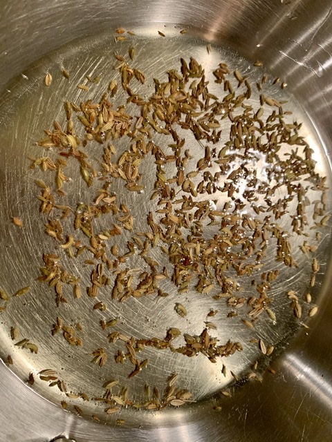 Heat up olive oil in pan. Add fennel seeds to toast lightly (if using).