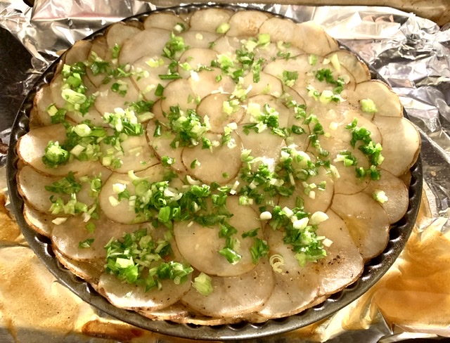 When the potatoes are soft, remove the foil, add chopped green onions to the top, and bake uncovered for another 15 minutes.