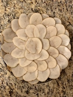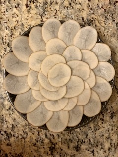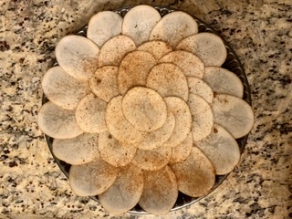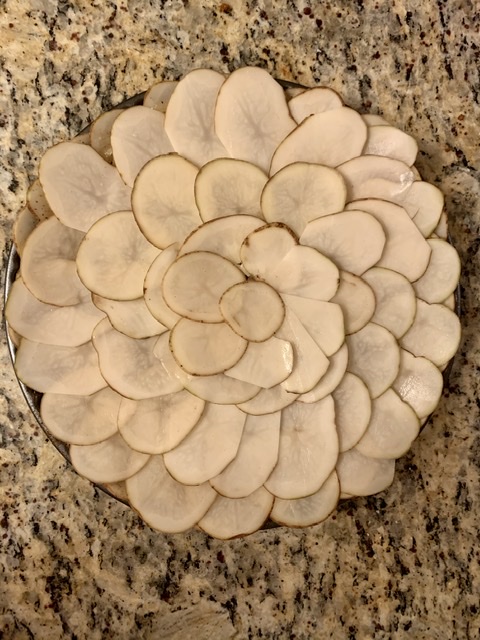 Starting from the outer edge of pan, arrange potatoes to overlap around the entire pan twice.