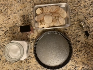 To prep and cook the ingredients you will need a 10 inch pie or quiche pan (preferably one with a removeable bottom), a medium sauté pan, and a very sharp kitchen knife or a mandoline slicer.