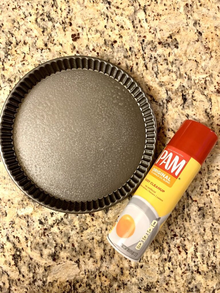 Let’s start by gathering all the ingredients. Preheat oven to 375°F. Spray the pie or quiche pan with non-stick cooking spray.