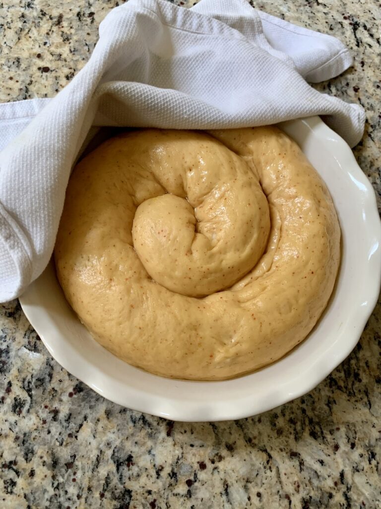 - Wind the long dough into a coil and tuck the end underneath. Firmly but gently, place the coiled dough in the prepared cake pan and cover loosely with a clean kitchen towel. Then, let it rise in a warm place for 1 to 1½ hours, or until it has doubled in size.