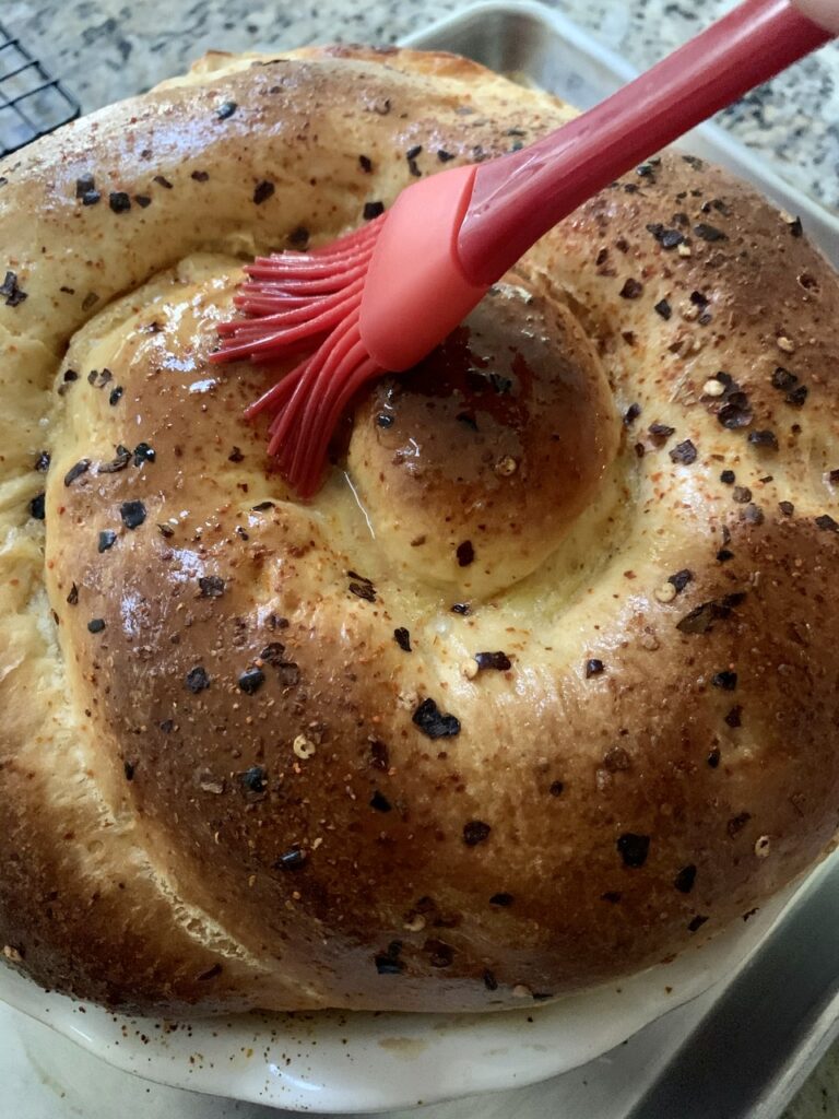 - Preheat oven to 350°F. When the dough has doubled in size, brush the top with the egg wash, then sprinkle with the red pepper flakes. Place the cake pan on a baking sheet. Pop the pan into the oven and bake until the loaf is golden brown, about 25 minutes. Rotate the pan, tent the loaf with aluminum foil, and continue to bake until the loaf registers 190° F, another 25 minutes.