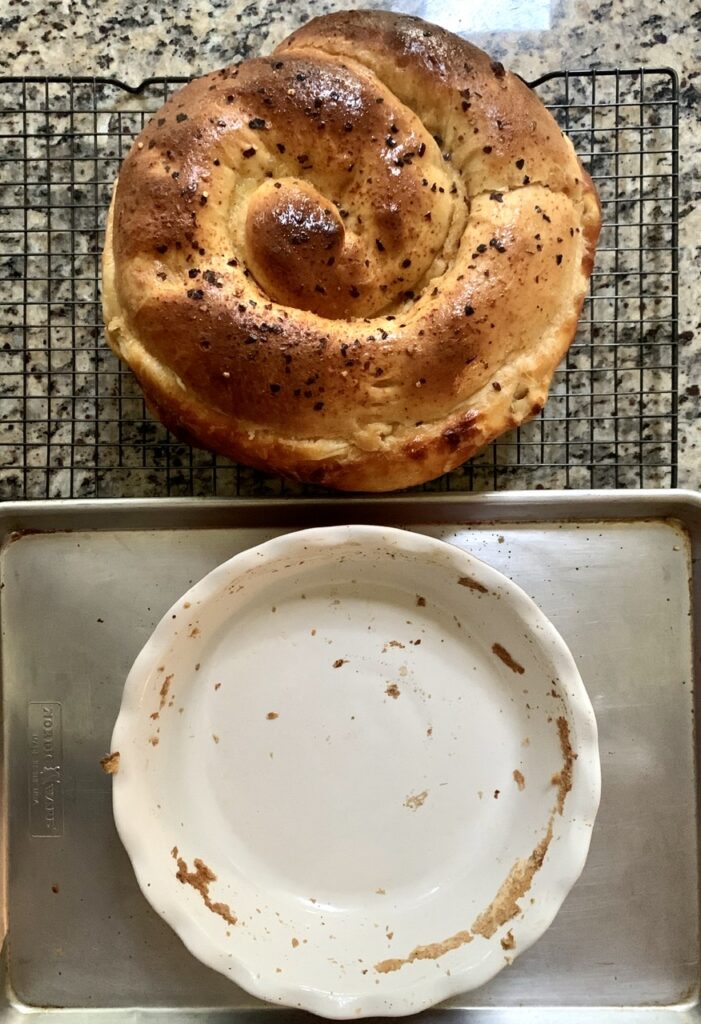 Wind the long dough into a coil and tuck the end underneath. Firmly but gently, place the coiled dough in the prepared cake pan and cover loosely with a clean kitchen towel. Then, let it rise in a warm place for 1 to 1½ hours, or until it has doubled in size.