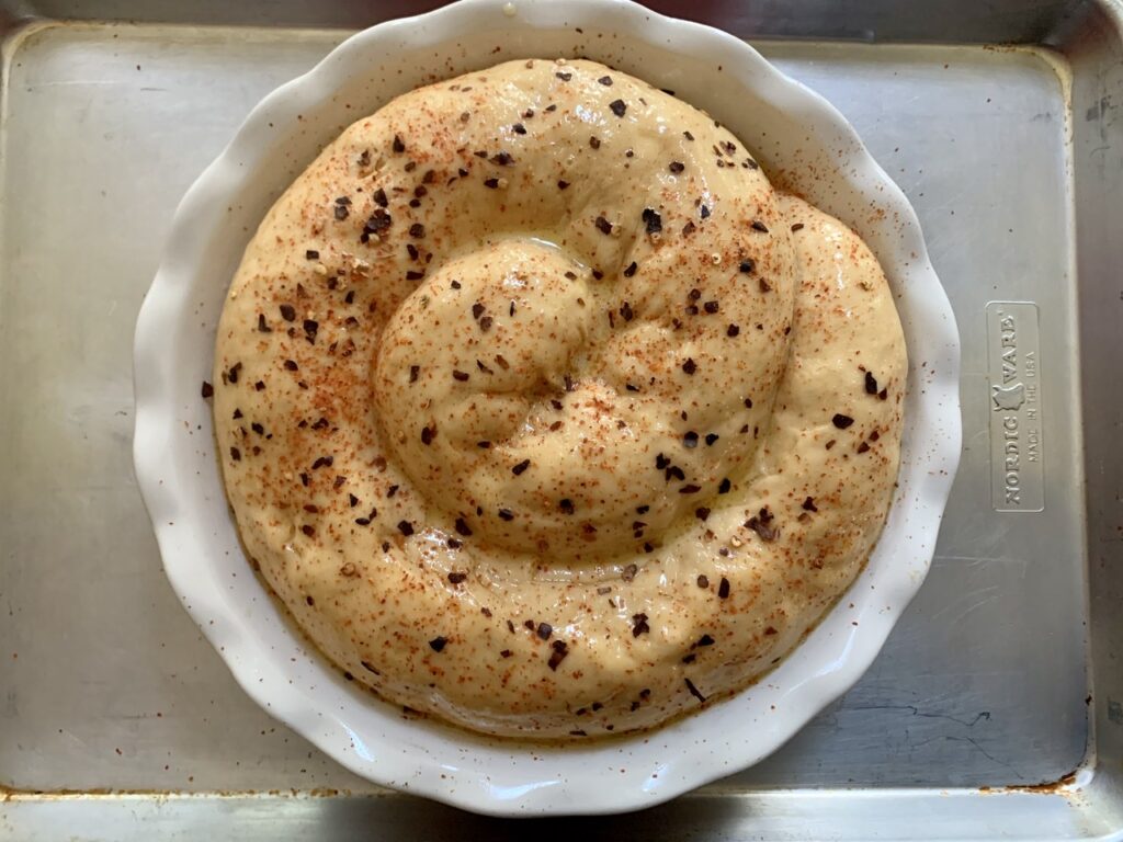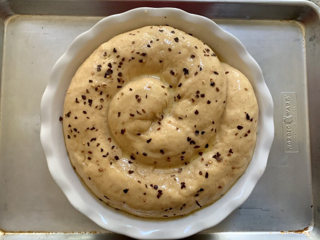 Preheat oven to 350°F. When the dough has risen, brush the top with the egg wash, then sprinkle with the red pepper flakes. Place the cake pan on a baking sheet.